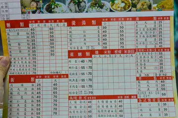 Dry Noodle with Sauce / 三醬麵 / 地瓜 葉 / 竹筍湯 / 米腸 蘿蔔糕 / 羊肉羹飯 / 肉丸子飯 / 肉燥飯 / 抄手 / 芝麻醬 / 梅花肉飯 / 菜頭粿 / 陽春麵 / 綜合羹 / 辣椒醬 / 餛飩麵 / 鮮蝦大餛飩