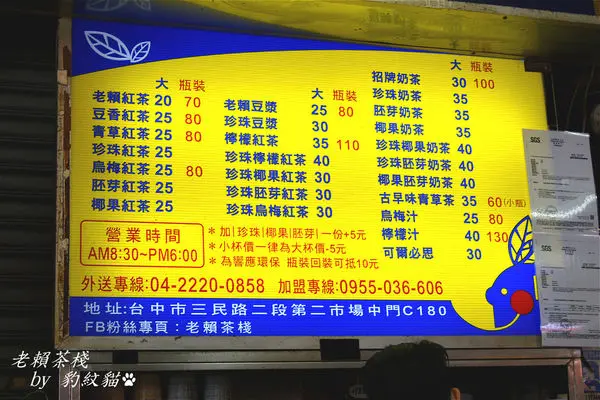 老賴茶棧 (台中) 網址: https://s.openrice.com/cHRSmW2lnu200 地址: 台中中區三民路二段87號(公有第二零售市場臨180) 電話: +886 0422200858