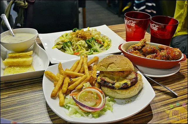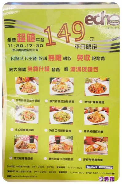 艾可先生在健行店發跡打響名號後陸續在勤美、一中更增設了分店想當初會知道這家也是同事品嚐過後丟張名片在我桌上要我找時間去探訪殊不知吃過後對它們的印象就超級好,只是想到每逢用餐巔峰時間人潮多就退避三舍這天call了自身的好姊妹相聚,選擇在我們都很喜歡的艾可先生才一陣子沒來門面用色大膽,粉桃紅色在角落邊還蠻突顯的門口有個大型看板,是平日時段內限定的超超超值商業午餐去的時間適逢"不給糖就搗蛋"的萬聖節前夕既然是美式風格的餐廳想必少不了有這些萬聖節南瓜、阿飄的裝飾如果我走進來對著裏面大喊"不給漢堡就搗蛋"不知道會不會就給我一份漢堡吼??((腦闆:@#$%%#^&%$#......幾歲人了還這麼幼稚...))螢光燈下舒適的用餐環境,心情是美麗的...店內提供的免費WIFI帳號、密碼就貼置在桌上的餐巾紙盒上面就不用勞煩再洽詢店家了,是不是很貼心!!!這區的座位我之前來的時候還沒有說多了這區塊就可以服務更多沒來過想來嚐鮮和來過要回味的顧客群了【菜單 MENU】隨手本手扎菜單關於腦闆阿賢的簡介與堅持有興趣的人可以詳讀一下看看艾可是如何從無到有牛肉類的漢堡,肉排還可以有單層和雙層的選擇一個單層牛肉漢堡居然不用200摳...好平價喔跟魚仔一樣不吃牛的人乖一點直接無視牛那頁的菜單我們還是有雞、豬、海鮮可以挑選,素食漢堡吃全素者不適用碳烤三明治價位160~180不等,餐點皆附無限暢飲部份飲品含濃湯、生菜沙拉升級套餐僅加價60元漢堡肉、義大利麵、、生菜、所有醬料都可以加點很彈性任意隨自己喜歡變化做加點...*~全新149元商業午餐~*點商業午餐義大利麵 免費升級為套餐(附濃湯及手工麵包)點任意主餐 飲料無限暢飲 點漢堡 附薯條及生菜並 *免收服務費*1. 德式紅醬豚肉麵2. 德式紅醬臘腸麵3. 田園鮮蔬奶油培根麵4. 美式碳烤雞腿堡5. 酥炸塔塔鱈魚堡6. 酥炸辣味卡拉雞腿堡7. 法式燻雞野菇麵8. 義式蒜香奶油蛤蠣麵9. 熱那亞青醬野雞麵◎有九種主餐可做選擇◎勤美店: 04-23029599 台中市西區向上北路137號一中店: 04-22253778 台中市北區一中街101號*~注意事項: ※ 此活動限平日11:30~17:30~*料好實在的濃湯,裡面的料一舀起來讓我們WOW~驚呼...因為裡面的料真的好多...麵包抹上的蒜味醬一樣是店家自製,蒜味很濃郁超級好吃【義式蒜香奶油蛤蠣義大利麵】超值商業午餐 NT$149元奶油白醬在店家巧手下熬煮出來的是不易膩口的口味就連盤圍一大圈的蛤蠣都很鮮甜入味發現到了嗎??麵條是屬於較細的義大利麵,我比較喜歡這種...軟硬適中的麵條將湯汁吸附和麵條合而為一體,不會是 麵是麵、湯汁是湯汁的那種囧態盤中狼藉過後不到最後一刻都捨不得讓店員將吃不完的麵給收走為了就是想在臨走前都還能有機會再吃下一口回味也好!!!9款義大利麵可以選擇還免費升級套餐有濃湯、麵包和無限量供應的飲品(可樂、雪碧、芬達、zoro、柳橙汁、檸檬茶)這樣才小資價149元...也太划算了吧!!!腦闆真是彿心來著...不過讓我痛恨的是,僅限週一~週五11:30~17:30讓我捶心肝的時段突然羨慕起住附近在週遭上班的粉領族喔!!!【美式碳烤雞腿排】NT$190元去骨雞腿排醃製在艾可特製的辛香料24小時以上才可以上碳烤檯大火炭烤封住肉汁再進箱爐烤而成,雞腿肉上的烙紋令人垂延欲滴最後搭配上特製美式燒烤醬...走美式風格餐點就是不能少了薯條薯條外酥內軟的好好吃呀~處理乾淨得宜的生菜、清甜洋蔥、牛番茄、酸黃瓜等的配料一併組合起來層層相疊的漢堡堆疊起來的高度不容小覷我們可是冒著下巴脫臼、露出裂嘴醜態嚇到隔壁桌客人的可能來嚐這美味漢堡的((吃漢堡就是要整個疊起來大口大口吃才叫做過癮))不過貼心的店家怕桌上擺有刀叉可以使用還有附了吃漢堡專用手套啦漢堡的配料真的很豐富碳烤雞腿肉質量也很讚,看看這麼厚的肉塊整個可口...((望著圖片兩側臉頰唾液不經意滋生))不公平、不公平、真的很不公平耶!!!!!為什麼店家自製特調帶有顆粒的花生醬就只有在牛肉漢堡區的菜單上才看得到???而我們這種只能乾巴巴瞪眼看著大口列嘴吃牛肉的人還能享有如此的福利...老娘怒了沒關係!!!既然你們有將花生醬擺放在單點區,我就自己單...點...一球來加...嘿嘿嘿大膽挖了花生醬放入雞腿排漢堡裡,豪氣啃食一大口有花生醬的地方...醃製夠味的雞腿肉搭上充滿濃郁花生香氣還帶有花生碎粒的花生醬,那口感是有層次的我只能用感動來形容,雖然不知道紅透半邊天的花生醬燒烤牛肉堡是何許的美味但是,對魚仔來說雞腿肉配上花生醬我是有一定程度的喜愛~吃了會口齒留香...【酥炸鱈魚塊】NT$90元酥炸小物是餐點前後、姊妹聚會、隨時隨地必備的小點!!!((我一直是這麼深信的...遠目))肉質鮮美的鱈魚塊被酥脆的麵衣包裹住一口塞入嘴裡,酥酥脆脆的外層、鱈魚肉的鮮甜味在嘴中化開酥炸鱈魚塊附搭了店家自製的塔塔醬我喜歡這個有洋蔥甜味的塔塔醬,吃到後來我都不沾炸物直接挖來吃了【美式碳烤雞翅】NT$90元先醃過再烤的碳烤雞翅相當入味碳烤雞翅搭配的是BBQ醬,這道點心讓友人吮指回味、讚不絕口*~熔岩湯堡與燉飯系列都有時間現定的嘗鮮價喔!!~*【酥炸奶香焗雞燉飯】NT$200元 嚐鮮價NT$189元千呼萬喚始出來,艾可終於推出飯食了對麻~哪有有賣義大利麵卻沒賣燉飯的道理???終於,在大家期盼下米飯系列上市囉來漢堡