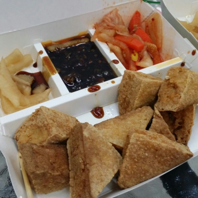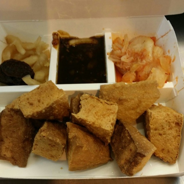 逢甲夜市美食。解饞小舖紅茶臭豆腐。獨特香氣及酥脆口感。韓國泡菜及梅漬蘿蔔再加獨門醬料。