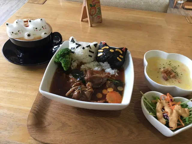 貓·旅行咖啡輕食館環境、餐點、咖啡處處都看的到超療癒の貓咪們😻*-。-。-。-。-。-。-。-*✔小編品嘗時間 by 2017/02/18✔ 臉書粉絲團 :如ㄦの悠閒食光✔instagram :hongruru0526✔ 此篇純屬個人食記分享,詳細的還是要各位自己去見識見識囉✔ 全文照片皆為本人所拍攝,如要索取請告知我~謝謝!*-。-。-。-。-。-。-。-*這家已經納入口袋名單很久了😆而它也開了差不多四年多了每天都生意興隆不只因為餐點很不錯,以"貓咪立體拉花"出名那是還有因為...有貓咪🐈但不大間,又在道禾六藝對面很常客滿而必須等位等很久我去的時後算是平日,一進去就有啦!幸運💕。▾ 店家門口*-。-。-。-。-。-。-。-*喜歡貓,喜歡書,喜歡旅行喜歡貓咪好奇慵懶優雅各種姿態喜歡文字堆疊出各種故事情緒場景喜歡旅行親踏感受世界各種面貌風情。這裡是舒適的小地方再加上用心的料理每一項餐點創造與眾不同的貓式料理<採用貓的圖案>使這裡成為了當地人、遊客、外國人愛去的休憩場所。(以上取自粉絲團)*-。-。-。-。-。-。-。-*店內裝潢採用草綠色及白色為主很清新舒爽的感覺而店貓咪有三隻~當時去的時候幾乎都睡翻天了😂。▾ 店家環境▾ 冰櫃內上層貓咪馬卡龍、下層是卡通造型蛋糕,模樣都超可愛超想咬一口😋▾ 這面牆是會不定時由一些攝影師、藝術家進駐展覽的這期的攝影師來自基隆的平大貓,展覽名稱叫做「我的海海貓生 特展」,展期2017/02/17~2017/4月▾ 展覽櫃&商品販賣櫃超多有關貓咪的商品啦!!!!💜💜💜各各都超可愛,有紙膠帶、背包、馬克杯、吊飾....等幸好我克制了...不然一不小心會燒了荷包😅▾ 這個是夾明細的,手繪的耶~超Q~▾ 這隻橘貓叫做果果,牠超扯,怎麼可以睡成這樣啦!!但是真的超萌😍,我超喜歡這隻的😘(忍不住狂拍,請見諒😅)▾ 牠呢!!是母貓~叫做米漿。也一樣懶懶地窩在角落睡覺,而店員說牠會比較兇,要小心一點。▾ 牠是綠茶,完全搶了一個座位了哈哈。我到那的時候牠還是醒的,一直在舔自己.....結果最後也睡翻了XDD*-。-。-。-。-。-。-。-*有輕食、下午茶、咖啡、簡餐想來個優閒的下午時光嘛~來貓旅行吧~~喝一下超夯的立體拉花