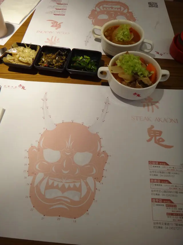 ▲肉質具有嚼勁、含油脂香氣。這次的台中之旅,大概有一半的行程都跟原本預計的不同。或說我們真的隨性,走到那玩到那吃到那。像第一天我們開車走文心路往大坑風景區方向,行經崇德路口等紅綠燈時,看到一旁紅黑色調的店家前排了許多人在等候。才發現這是傳說中的「赤鬼」,於是決定隔天的午餐來這解決。▲紅黑色系鮮豔特別的建築外觀▲門口的排隊人潮▲門口餐點的照片看起來,還蠻令人垂涎的▲菜單-餐點的價格算是平價建築外觀紅黑色系鮮豔又特別的造型,讓人經過時不得不多注意兩眼。在等候時,小朋友們則是和那隻坐在門口的乳牛造型擬人塑像,玩到非常開心。往前經過會發出哞哞的聲音,往後經過則是發出放屁聲。我則是看了一下門口的菜單,才知原來赤鬼賣的是平價的排餐。從照片看起來,排餐還蠻令人垂涎的。▲用餐環境很舒適▲氣氛不太像平價牛排館能吃到的Fu▲羅宋湯、玉米濃湯▲羅宋湯▲酸洋蔥、韮菜、酸菜▲女兒心血來潮,把排餐的麵條和上酸洋蔥、韮菜。口感還不錯!▲飲品區進到店內,感覺裝潢比一般的平價牛排館金碧輝煌、舒適乾淨許多,不像是來吃平價牛排的。但這裏可不是那有沙拉吧吃到飽的複合式牛排館,這除了羅宋湯、玉米濃湯、飲品可以免費自取外,其它還有的就酸洋蔥、韮菜、酸菜。▲無骨牛小排▲無骨牛小排▲無骨牛小排-切面▲附餐-餐包▲日式黃金雞腿飯-酥烤雞腿排、日本越光米飯、生菜沙拉、鯖魚、土瓶蒸、海帶芽+小菜▲日式黃金雞腿飯-表皮金黃酥脆▲日式黃金雞腿飯-肉質鮮嫩、香氣十足▲日式黃金雞腿飯-小菜▲日式黃金雞腿飯-沙拉▲日式黃金雞腿飯-土瓶蒸▲四大一小整桌下來約花1200左右,吃得算不錯又吃得飽【後 記】用完餐後的感覺,以相對價位來比較,赤鬼雖沒有沙拉吧吃到飽的服務。但對於我這種肉食性動物而言,赤鬼牛肉口感柔嫩鮮甜、兼具嚼勁、肉質也較好。對於我這種已很少去吃吃到飽的人,單純只想好好享用排餐的人而言,這算是還不錯的地方。…查看更多