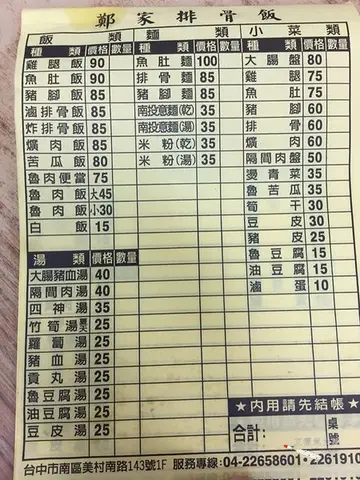 外食族每到下班或放學時刻,都會想晚餐應該要吃什麼?!偶爾艾薇也不例外,趁著週五夜晚與彭先生就近解決,剛好這間〖鄭家 排骨飯豬腳飯〗進入了彭先生的目光內,就有了這次的食記!〖鄭家 排骨飯豬腳飯〗主打家常便當,便當價位皆落在75~90元之間,還有各式各樣的滷菜和小菜可以選擇,餐點有三菜一肉再淋上鹹香的滷汁份量算適中,榨菜和筍乾酸脆的口感頗棒,主餐肉品份量大塊,吃膩了正忠排骨飯的話,也可以來這邊吃點不同口味的餐點喔店面不大不小,耀眼的紅在夜晚特別的明顯,難怪會入彭先生的眼餐檯上擺滿了筍乾、榨菜、滷排骨和滷汁。餐台髒亂些且服務阿姨的臉都頗臭,好像我們欠她錢似的餐廳內的環境乾淨且明亮,還有電視可以看〖鄭家 排骨飯豬腳飯〗菜單所有餐點價位皆無破百,飯類價格跟許多便當店落差不大,餐點項目皆屬常見 雞腿飯 $90元便當類型的餐點,艾薇習慣會跟正宗排骨做比較拉 哈哈菜色雖有三菜一肉,菜色中的榨菜和筍乾較屬於小菜,榨菜和筍乾的份量很多且酸脆的口感表現很不錯,但唯一的青菜太過油膩了,讓艾薇碰沒幾口雞腿有炸過,吃起來的肉質偏乾柴,艾薇覺得正忠的雞腿比較好吃 滷排骨飯 $85元滷排骨的外皮超厚,有肉的1/2厚,滷汁的味道淡淡的鹹香很不錯,但就是肉質太乾澀且無入味,艾薇不推不推 評語:〖鄭家排骨飯豬腳飯〗用餐環境蠻乾淨的,但服務態度不怎麼好,餐點價位跟一般便當一樣飯類都有三菜一肉,三菜基本榨菜和筍乾是固定菜色的,另一菜色會依店家採購的菜色做更換,菜色較油只有筍乾不錯吃,排骨和雞腿的份量適中但肉質太過乾澀,且排骨的外皮裹的太厚讓人....整體來說,就是雷雷的⌽ 此次用餐為自費⌽ 以上言論為個人觀感,只作為參考鄭家排骨飯豬腳飯 地址:台中市南區美村南路143號 電話:04 2265 8601 官網: 營業時間:11:00-22:00 周邊停車:機車&汽車/ 店前或白線上…查看更多