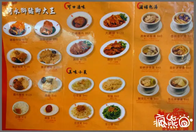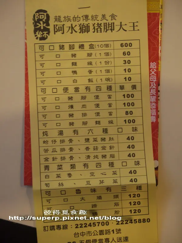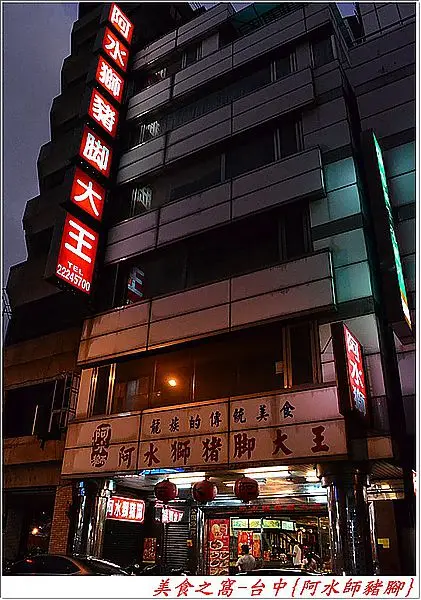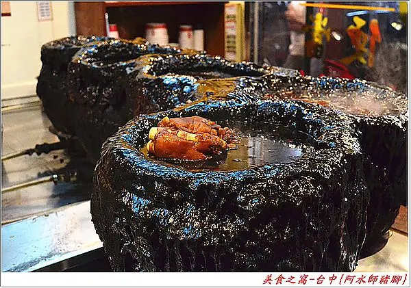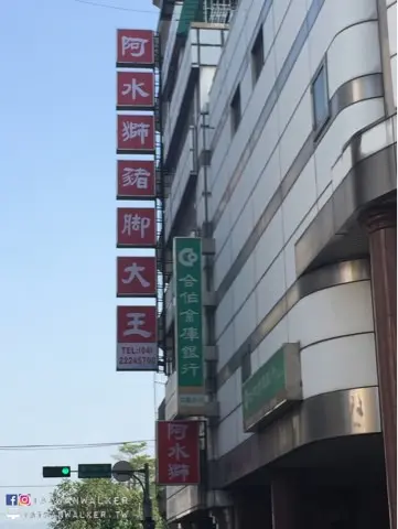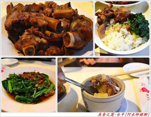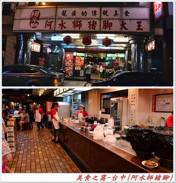 阿水獅豬腳是一間百年傳承的老店在進門時就可以看到幾個滷豬腳大甕.我還好奇的問著他們.你們的鍋子好特別喔他們答說是從來不曾刷洗的滷汁堆疊而成這也可以說是一種奇觀吧~我們很喜歡吃豬腳.常常嘴饞了就會來吃一下都是來台中公園這邊進來後服務人員會指引你坐哪邊之後menu很快就會遞上蠻多人來外帶便當的豬腳麵線、豬腳便當每份均115元點餐就看你要吃白飯還是麵線.然後點豬腳.小菜.湯品 坐在裡頭都有聞到陣陣香氣呢~ 也可以宅配到家.蠻方便的.有微波爐就用微波.沒有的話應該就用電鍋蒸吧豬腳禮盒一盒750元(豬腳10塊)白飯+豬蹄+苦瓜湯(james點一份這樣) 白飯$15上頭有加一片淹漬蘿蔔豬腳(腳蹄)$75豬蹄有對切.滷得很透.已經很好入口可以放進嘴中直接拉出骨頭來苦瓜排骨湯$40燉的湯品味道都鎖在裏頭.喝起來會回甘淋上滷汁的燙青菜$40豬腳麵線(中段)$115麵線有淋上滷汁.吃起來很順口不會覺得太乾光顏色就知道滷蛋滷得很夠味豬腳都骨肉分離了很好入口 其實我們真的很愛吃豬腳.除了吃自己滷得之外通常都是吃阿水獅豬腳大王的他們家的豬腳每回james吃完總是憑點頭說好好吃有點家常但又隱藏著老師傅的功夫秘笈.應該說吃起來是一種傳承的滋味吧!我覺得滷汁拿來拌飯一定很好吃.…查看更多