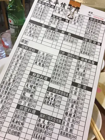 大器烏魚子 / 牛排 / 炒 水蓮 / 炒海瓜子 / 炒麵 / 空心菜 / 炸魚 / 帶魚米粉 / 清蒸魚 / 清蒸鮮魚 / 綜合生魚片 300 / 蒸大蛤蜊 / 蝦仁煎 / 燙蝦 / 鵝肉 / 鹽燒九孔鮑 / xo醬燴三鮮 / 三點蟹炒蛋 / 綜合刺身 / 鹽烤竹蛤