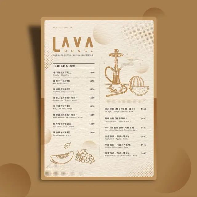 LAVA Shisha Lounge 水煙餐酒館 (台中) 網上訂位即賺Rice Dollars 網址: https://s.openrice.com/cHRSmW2L5G800 地址: 台中西屯區逢甲路17號2F 電話: +886 +886424523917