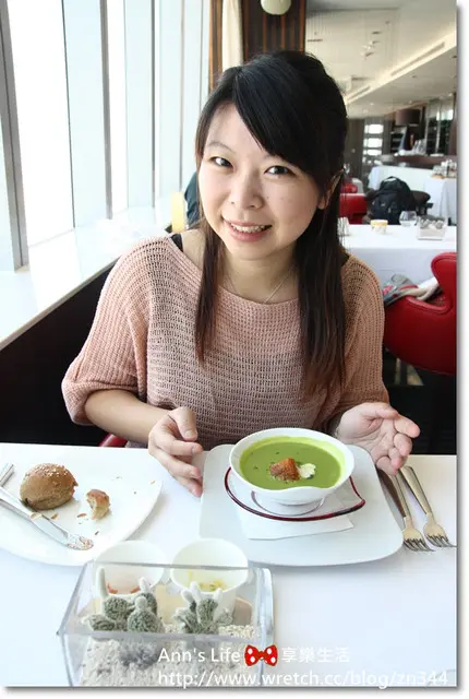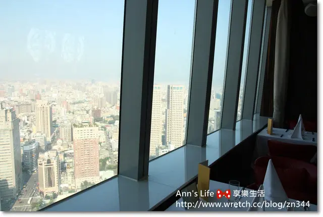 星期一中午退房後先把行李安置在大廳,從1樓搭乘電梯上46樓準備用餐,我和J調皮的計算起電梯秒數,1層樓約只花1秒鐘時間,高速電梯果然快的驚人!和餐廳門口的服務人員報上訂位姓名,服務人員就領著我們入座,體貼的是服務人員還會先為女性拉椅子,服務周到沒話講,只是被女性員工拉椅子感覺怪不好意思的。