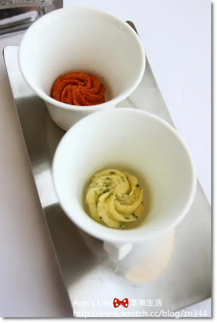 幫麵包加分的是特製蒜味奶油及風乾番茄,蒜味奶油不必講,奶油搭配素麵包一向最合調,尤其蒜香滿溢更提味,味道自然再上一層;風乾番茄就顯得特別多了,奶油試過、果醬試過、油醋甚至緹魚醬都嘗試過,風乾番茄醬搭配麵包倒是第一次,不過味道很熟悉,頗像某種義大利麵或是披薩上會出現的茄汁味道,香濃再帶點甜酸,我也挺喜歡的。