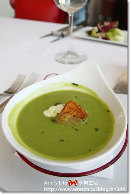 套餐部分的湯品有兩種選擇:慢燉松菇清湯附鴨肝餃or奶油青豆湯,清湯的命名乍看之下很令人心動,但酷愛濃湯的我還是敵不過奶油青豆湯的招喚,翠綠色的湯頭濃稠且濃郁,青豆的重擊從舌尖開始入侵,雖然濃郁卻不覺膩,