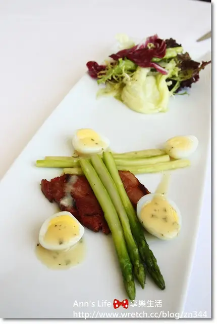 前菜培根鷓鴣蛋沙拉佐香芥醋汁這道無法選擇的前菜真是太絕,幾樣食材擺在一起很難聯想到昂貴,但偏偏每樣食材都表現得淋漓盡致,也更顯出頂餐廳融合東西方異國料理入菜的精髓,鷓鴣蛋沾醬鮮彈是其次,煎烤過的厚培根香氣十足又因為厚度有別於一般常見的培根,更加有咬勁,加上能把我一向沒有好感的蘆筍處理的好鮮嫩,這肯定是食材本質出色的關係吧!一邊是重口味的肉類,一邊就搭配醋酸的新鮮生菜,真感覺中西合璧卻不衝突的美感。