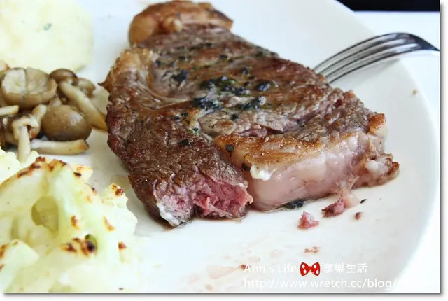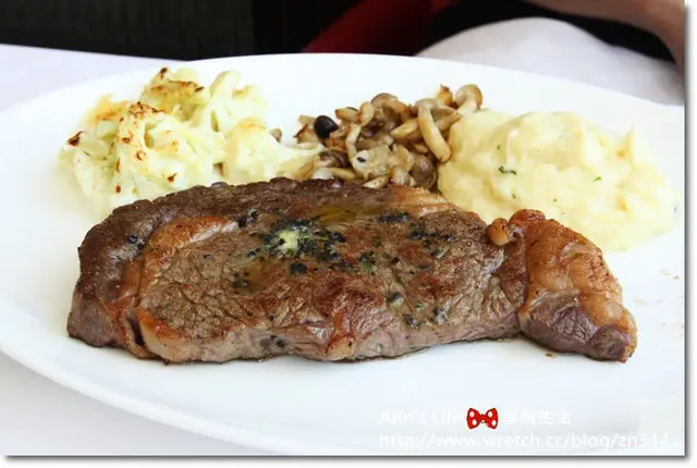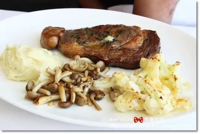 油花分布在中間,油脂頗多,我們都很愛富有油花的肋眼部位,越吃越上癮,而單點雖然沒有前菜和湯品但仍能選擇一款醬汁、一種配菜、一種蔬菜和一樣附食,種類頗多難以選擇,幸虧專業的服務人員在一旁提供許多意見及介紹,最後牛排上佐的是珍貴的松露奶油,配菜則是日式較清爽的炒鴻熹菇,蔬菜挑選了焗花椰菜,附食則是J完全沒有遲疑的蒜味洋芋泥,每樣都很棒!讓我拼命偷吃他的配菜咧~