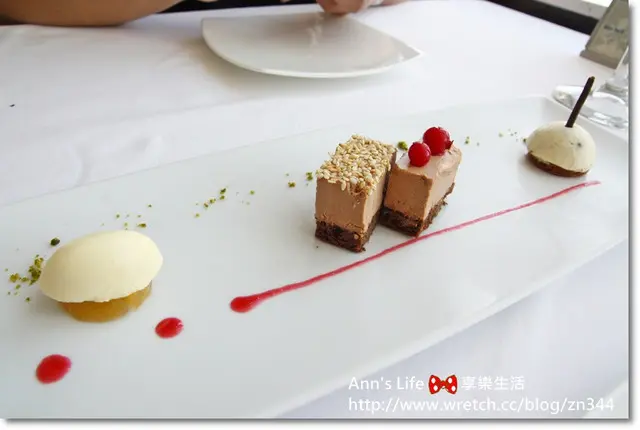 飯後甜點為主廚特製甜點,食用順序由左至右為百香果帕妃、巧克力慕絲、義式水果蛋糕,百香果帕妃的味道清甜果香,下方的果肉加上上方的慕絲是我沒嘗試過的甜點很好吃,巧克力慕絲乍看之下很平凡,但灑滿芝麻的巧克力慕絲入口滿是芝麻香,卻和巧克力的味道衝撞出一股特別的氣味讓我好驚喜,多種水果入料的義式水果蛋糕濃郁搭配手工製作的酥脆塔皮更是教人難以忘懷,真沒想到吃到最後一刻都還是讓我驚喜連連。