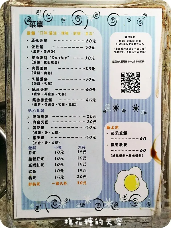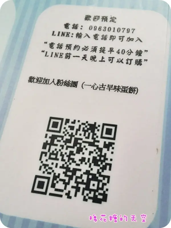 菜單上還有店家的QR Core,可以在用餐的前一天先用LINE預先訂餐~整個科技化來著。敏敏到的這天是個星期天,我大概七點半到現場前方就已經站了不少人在排隊了,約莫等了半個小時點到餐,接著大概再過了十分鐘左右才上菜,所以時間比較趕的朋友記得一定要提前預定喔。