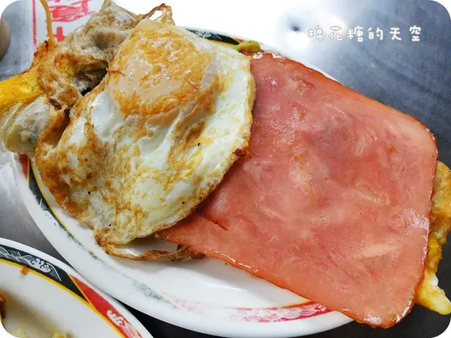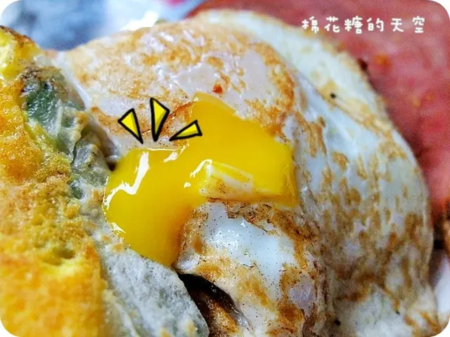 蛋黃、蛋餅、肉鬆、火腿~早餐就是要吃的這樣豐盛啦!應有盡有!夾起一小片蛋餅沾滿了的蛋黃送進嘴裡,用這樣迷人的滋味來開啟一天的早晨你說多好?~
