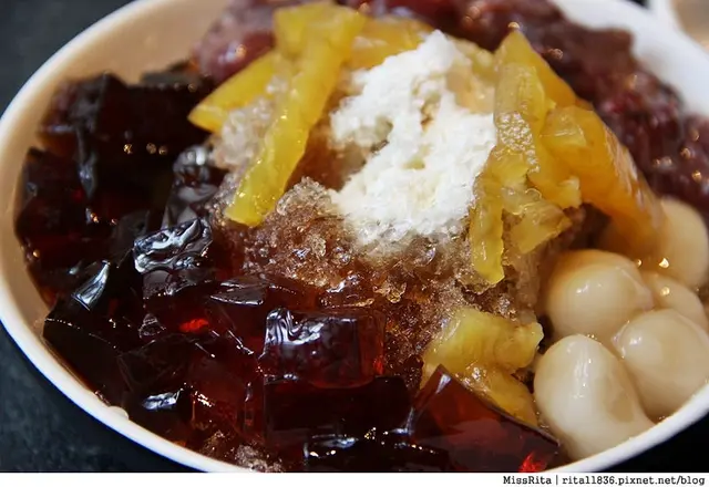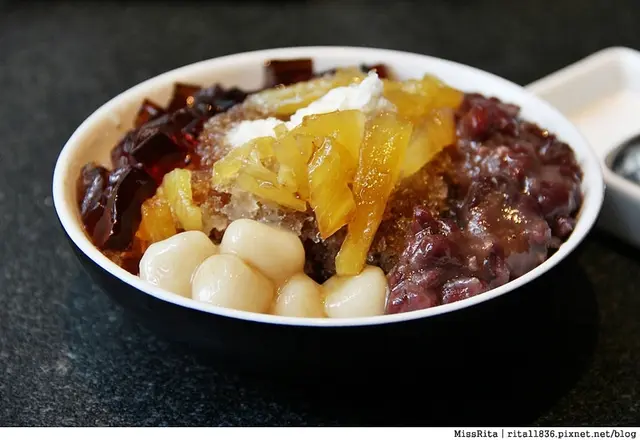 配料有仙草凍、白玉糰子、蜜鳳梨和紅豆泥等等,搭配香甜的黑糖蜜和些須的奶油