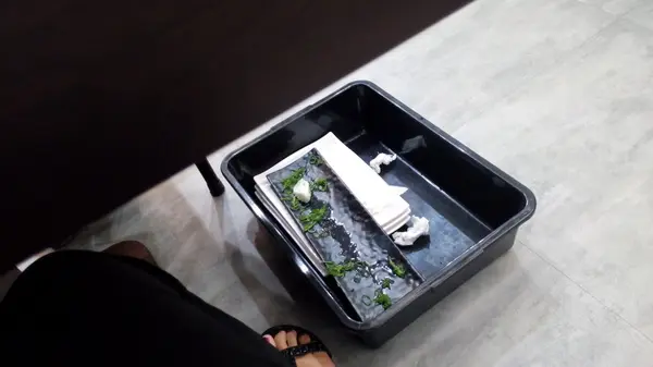 店家不像一般火鍋店,桌上放置小垃圾筒,而是直接放一個大大的塑膠盒在桌面下,給客人丟垃圾、盤子喔~
