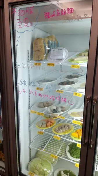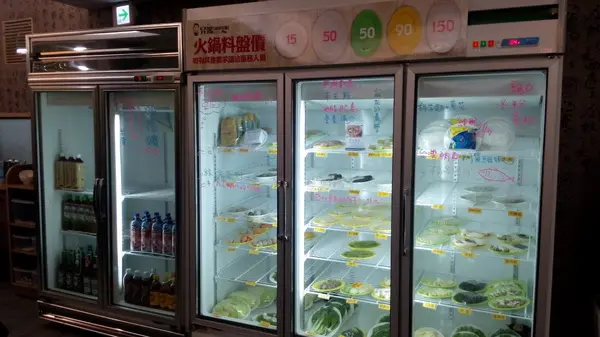 一旁的冰箱放著滿滿的食材,價格依盤子計算,