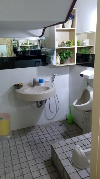 樓上、樓下都有廁所,樓下的廁所還用珠簾隔開,門板上有可愛男、女娃娃圖示,