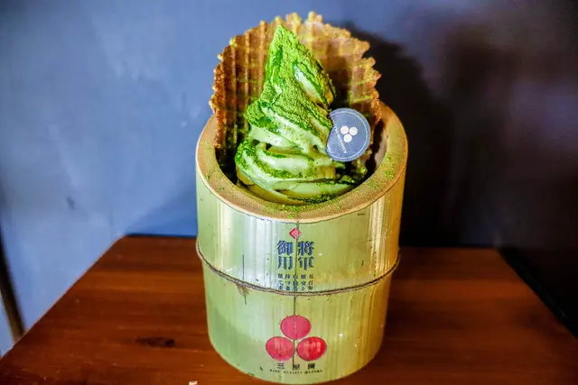 竹子碗裝著撒上滿滿抹茶粉的冰淇淋 裡面還有紅豆 白玉 跟麥片