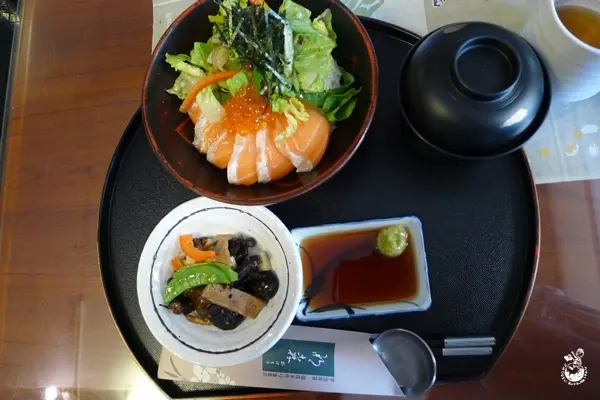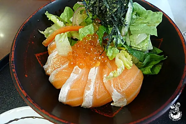 有鮭魚卵和新鮮鮭魚肉,視覺效果很好,光看就覺得很美味