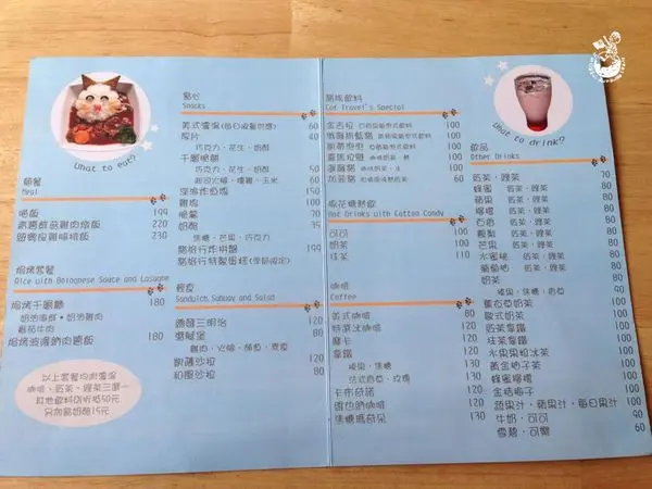 貓旅行的menu,餐點不多,大多數的客人都點左上角有附圖片的喵飯