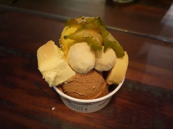 掙脫了限制的框架,除了在眼科賣起名產和冰品,就連冰品的配料都是出乎預料。首先,冰淇淋的種類很多,大致上咖啡、水果、茶和巧克力四大類,又各自細分多種選項,不管你是要光陰的故事(東方美人茶、菊花、肉桂),還是半夢半醒之間(祁門紅茶、玫瑰、薄荷),復古又有趣,種類不勝枚舉。配料方面更是新奇,杏仁榛果是基本款,土鳳梨酥、楊桃乾、起司蛋糕甚至花生糖、綠豆酥應有盡有,沒有想過這樣的搭配竟然一點都不突兀,還意外的廣受好評。