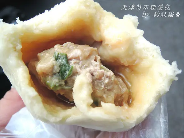 輕輕的將外皮撕咬開,包子面皮柔軟香甜同時帶有Q勁,雖然比一般包子略厚,喜愛麵食的阿貓覺得很好吃。【天津苟不理湯包】並沒有因此讓內餡顯得孱弱,結實飽滿的豬肉團,可清楚看見肉塊纖維混著些許蔥花。