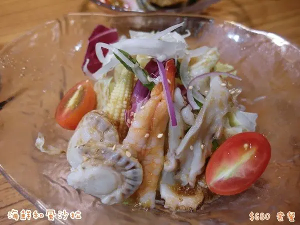 有貝類 章魚 蝦子 玉米筍 洋蔥 番茄 生菜....