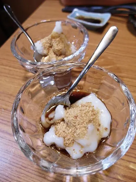 這道甜點像米布丁又像更軟的碗粿 上面撒上黃豆粉 下面是黑糖漿
