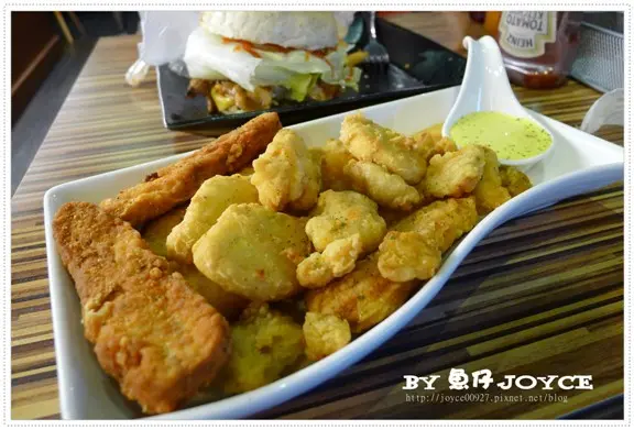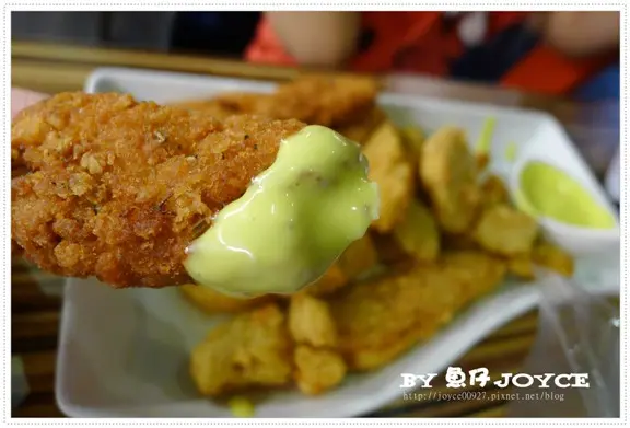 炸物附上的是我喜歡的黃色蜂蜜芥茉醬,炸物火侯控制的恰當...我品嚐雞柳條時還有些許的湯汁呢