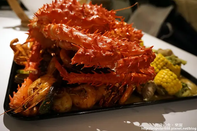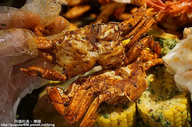 每個人也沒有單獨的盤子,就戴著手套直接從裡面拿著吃,海鮮的殼或是吃過的玉米就直接放在桌面,桌上墊著是一張紙,全吃完之後服務生會將它包起來整理。