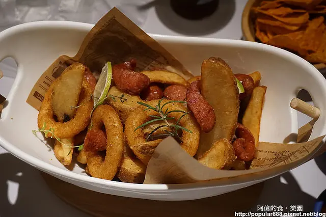 裡面有黃金脆薯、洋蔥圈、德式香腸