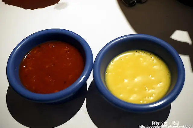 兩種醬,左邊的是辣醬,右邊的是蜂蜜芥末醬