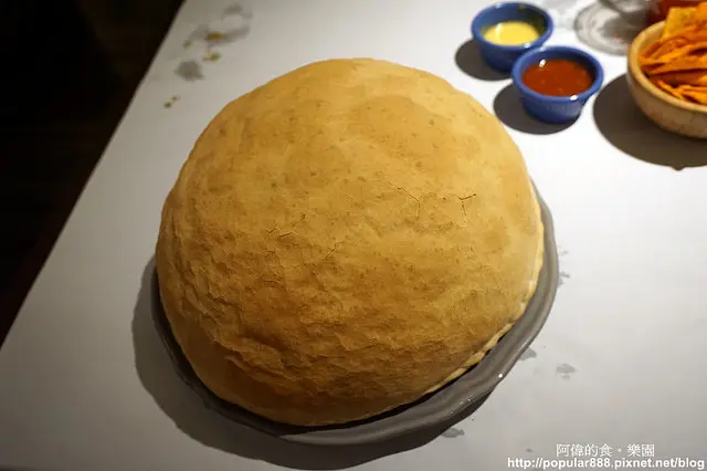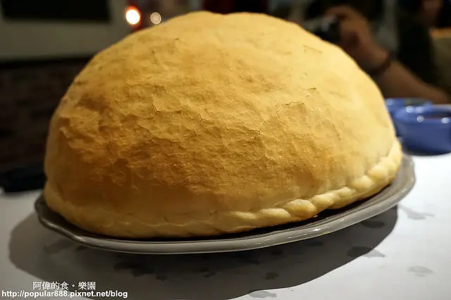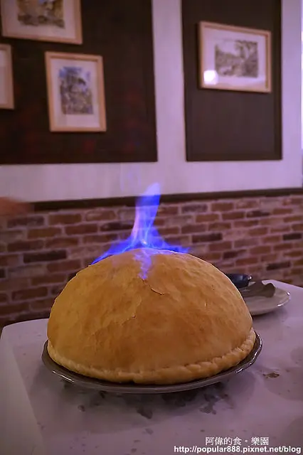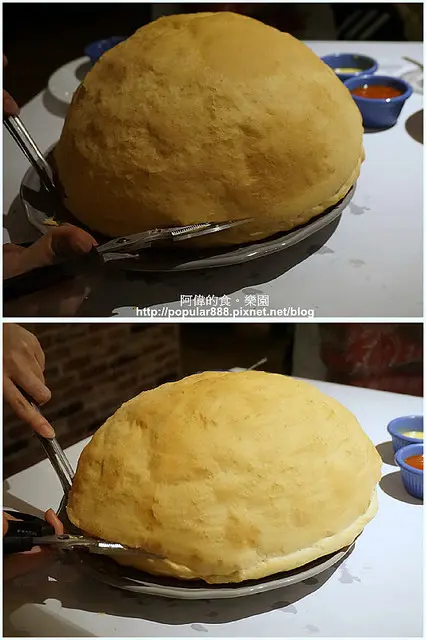 火熄之後,服務生用剪刀從邊緣剪開,這個半圓型也比較"消氣"了一點。