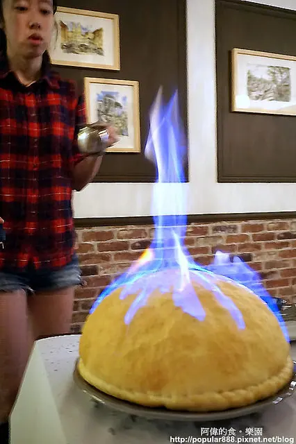 服務生以迅雷不及掩耳的手法,在表面淋下了"橙酒",竟然就燃起了火燄,我還沒看清楚她從哪裡點的火啊?這驚人一幕讓我們看呆了,只聽見"哇哇"的叫聲,還有相機快門喀擦喀擦的聲音。