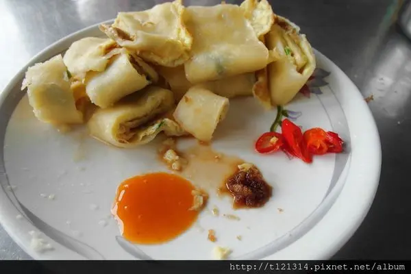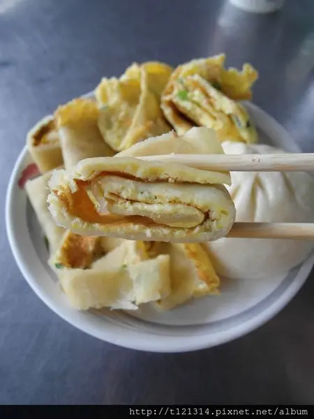 蔥花蛋蓋上一層蛋餅皮,稍稍煎過後捲起。令人意外的是竟然完全不油!