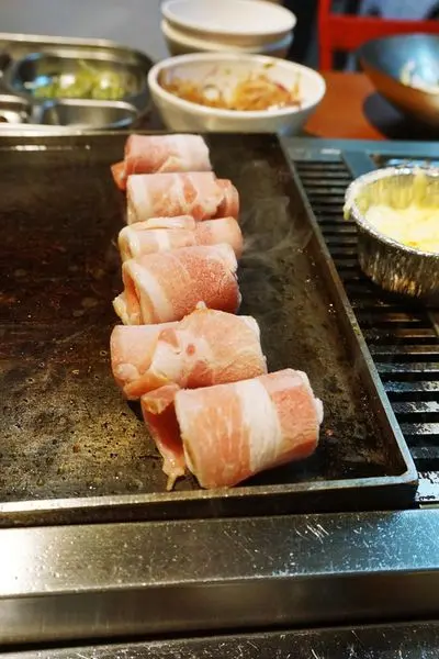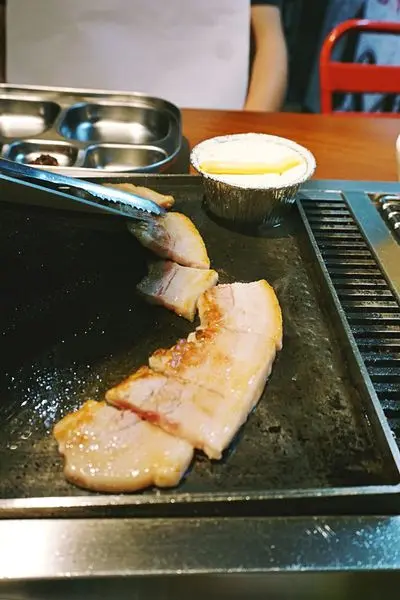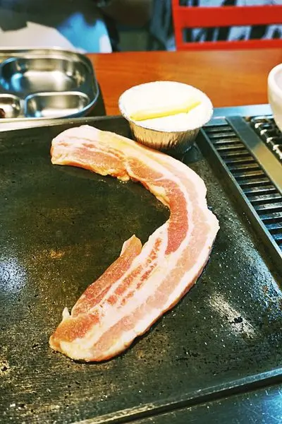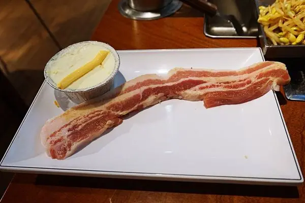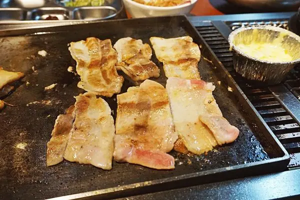 當店員將三層肉放到烤盤上 聽到滋滋作響聲 接著聞到香氣 口水都要留下來沾