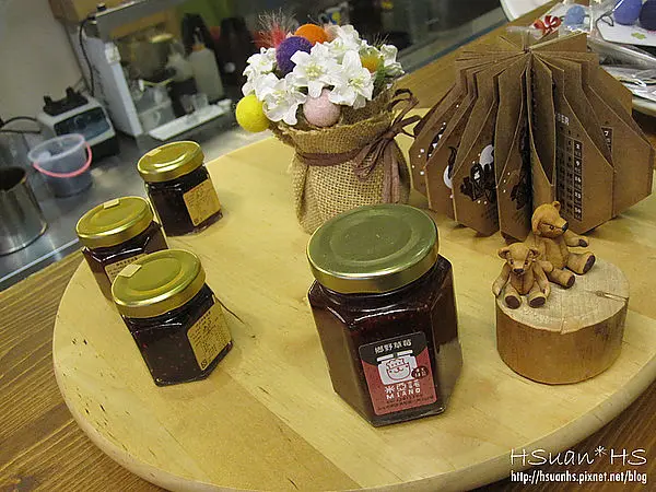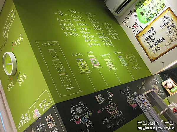 燈罩是他們手工抹醬的玻璃罐,把主打販售的商品結合在裝潢內。