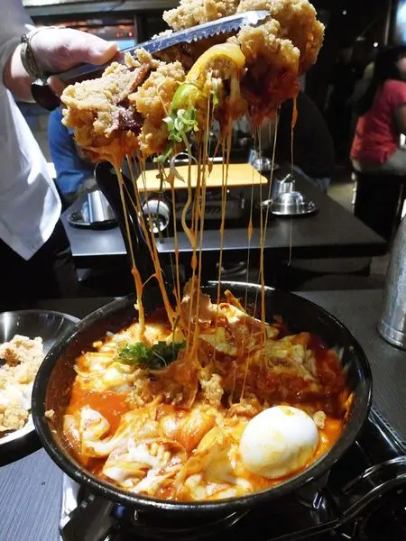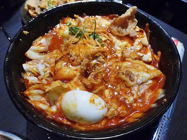 下面的鍋裡面有韓式年糕 甜不辣 洋蔥 高麗菜 蛋....等等