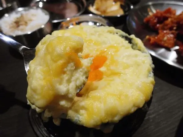 用湯匙挖起牽絲的起司跟蒸蛋完美的結合
