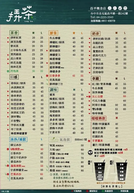 ▲MENU整體種類蠻多的,加料價格也很便宜,持本店塑膠瓶/玻璃瓶,氣泡飲系列可折價10元!