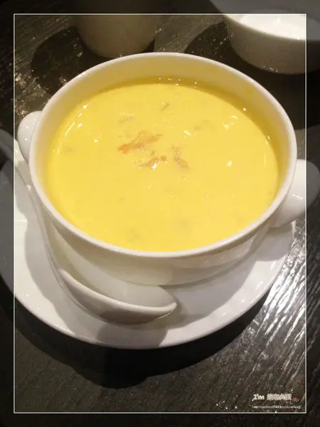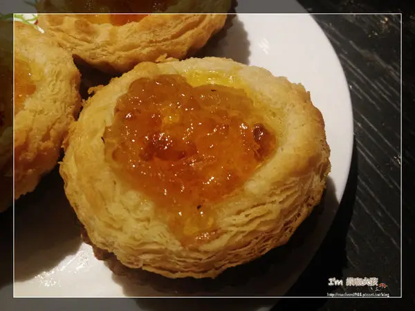菜單上面的解說: 港式酥皮蛋塔,捏在手裡酥得就像要鬆散的質地,蛋香溫潤,上面用糖水浸過的桃膠,更是美顏珍品。