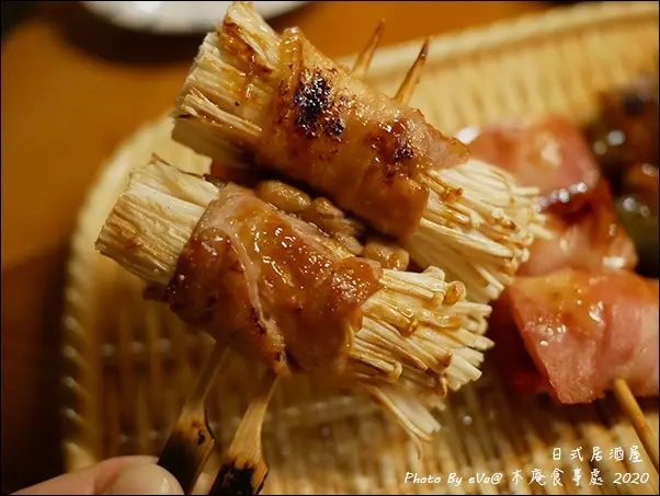 外面的豬肉烤熟,包裹在裡頭的金針菇有些還是生的