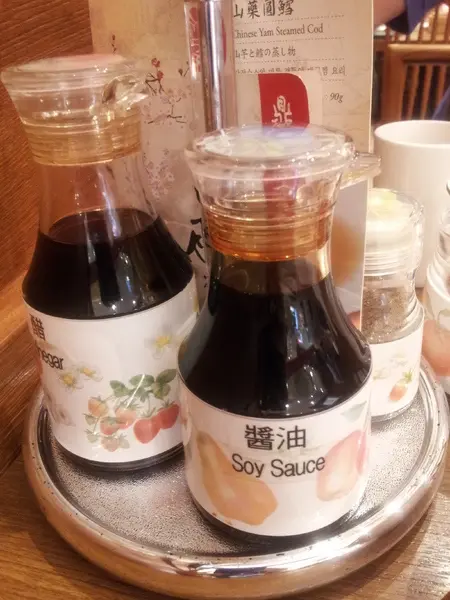 桌面上有醬油跟醋,很乾淨沒有沾出來的情況,
