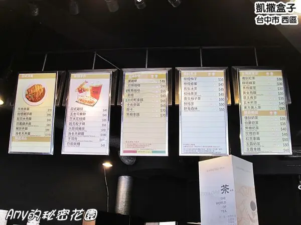 凱撒盒子有台灣原葉茶(手搖茶)、繽紛果漾(水果茶)、醇奶樂園(奶茶)、經典咖啡....等等多款飲品任君選擇