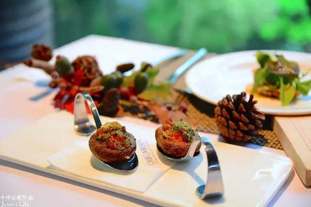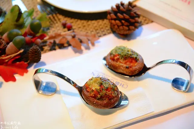 塞進去香菇裡,再淋上自製的番茄醬和蒜蓉奶油,最後灑上香草麵包粉,建議一口吃下