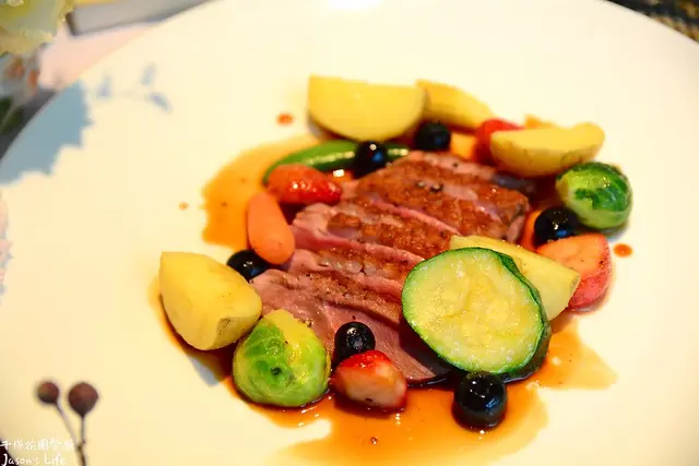 【嫩煎低溫舒肥宜蘭櫻桃谷種鴨胸香炒時蔬莓果醬汁:780元】