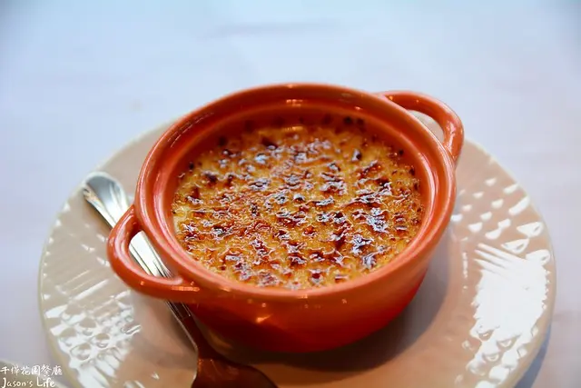 烤布蕾上層利用噴槍把焦糖融化成一層脆片