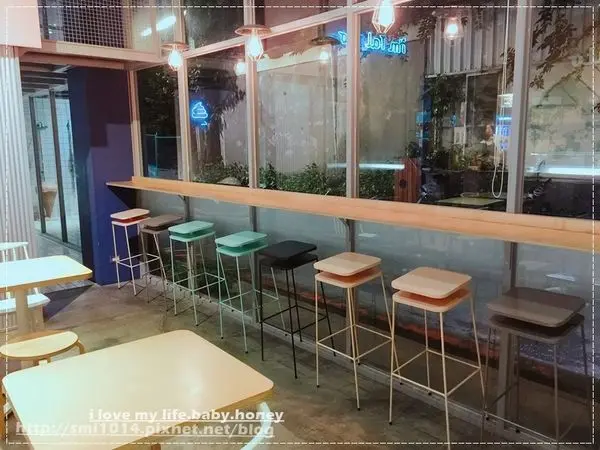 靠窗這排座位利用馬卡龍色系的高腳椅交錯擺放,帶著甜滋滋的氛圍