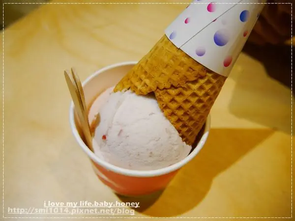 我點了一個雙球甜筒,冰淇淋口味是白蘭地葡萄+紅心芭樂